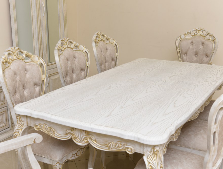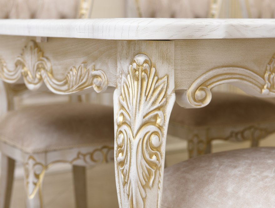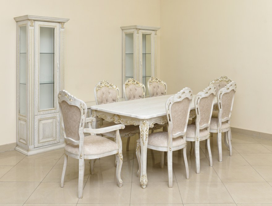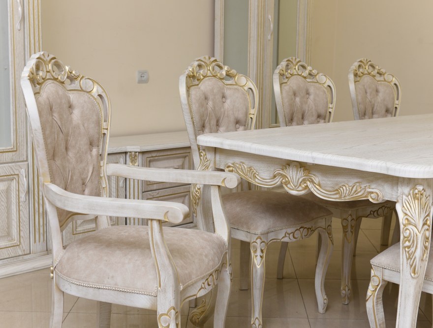 | ՆՅՈւԹ | Ընդհանուր հումքը՝ փայտ։ Աթոռների հումքը՝ հաճարենու փայտ, քանդակները՝ ձեռքի աշխատանք։ Ներկանյութ՝ էկոլոգիապես մաքուր ու բարձրորակ իտալական ներկանյութ, պատինա կոչվող լաքապատման նյութը շքեղ տեսք հաղորդելու համար։ Սեղանը՝ ոտքերը և աշխատող մասերը փայտյա՝ ամբողջությամբ պատված ծեռքի քանդակներով։ Երեսամասը՝ ՄԴՖ-ի վրա փակցված փայտե շպոն, վրան ներկված էմալապատ իտալական ներկանյութով։ |